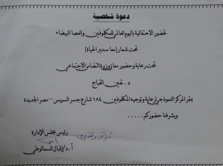 تحت رعاية د . نيفين قباج وزيره التضامن الاجتماعي وبدعوة كريمة من الأستاذة الدكتورة اقبال السمالوطي رئيس اللجنة الاجتماعية بالاتحاد شارك إتحاد قيادات المرأة العربية برئاسة الدكتور ة بدرية سليمان وفي حضور الأمين العام للإتحاد الدكتورة هالة عدلي حسين في احتفالية اليوم العالمي للمكفوفين والعصا البيضاء