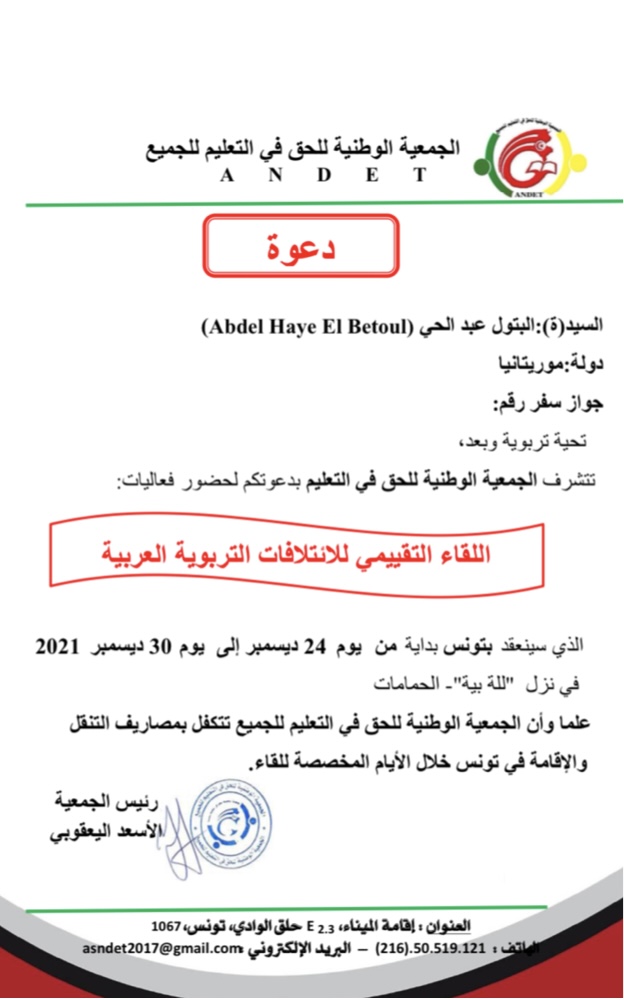 بدعوة كريمة من الجمعية الوطنية للحق في التعليم بتونس مشاركة الدكتورة البتول عبد الحي رئيس لجنة التربية والتعليم والبحث العلمي في اللقاء التقييمي للإئتلاف التربوية العربية والذي سيقام بالأسبوع الآخير من الشهر الجاري بتونس ويأتي هذا تنفيذا لخطة الإتحاد بتحقيق أهداف التنمية المستدامة حيث يحقق الهدف الرابع “التعليم الجيد”