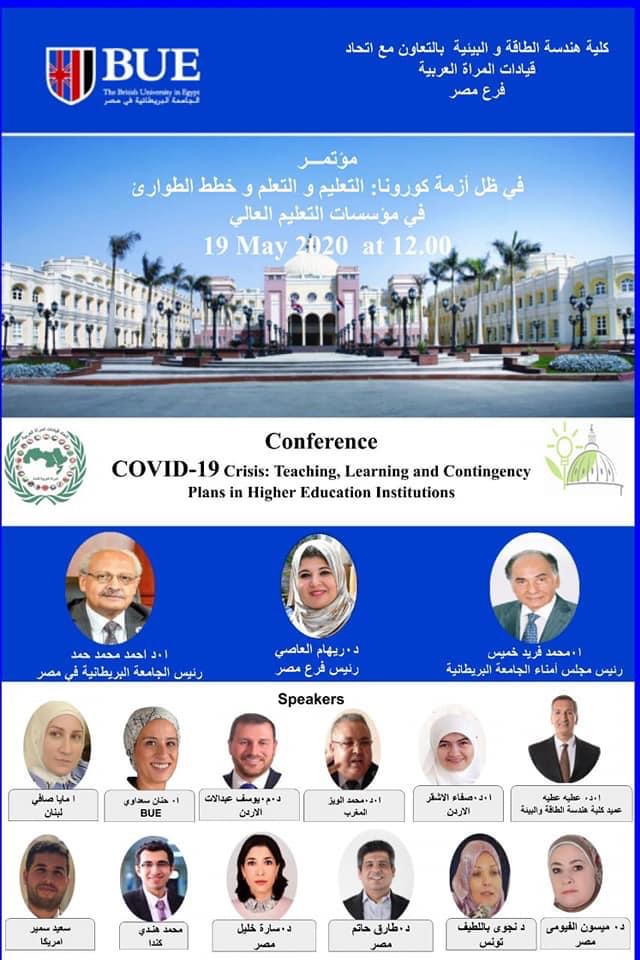يسر اتحاد قيادات المرأة العربية جمهورية مصر العربية بدعوة سيادتكم للمشاركة فى مؤتمر : “التعليم والتعلم خطط الطوارئ فى موسسات التعليم العالى فى ظل ازمه كورونا.” بالتعاون مع كلية هندسه الطاقه والبيئة الجامعه البريطانية .