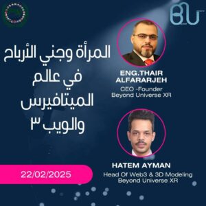 يحمل المهندس ثائر درجة الماجستير من المملكة المتحدة في تطبيقات Metaverse في الأعمال الدولية والتعليم، خبرته مدعومة بالعديد من الشهادات العالمية، بما في ذلك خبير Microsoft العالمي المعتمد في الواقع المختلط وشهادات من مجلس Blockchain في Metaverse وWeb3 والمنظمات اللامركزية المستقلة (DAO). وهو يسعى حاليًا للحصول على درجة الدكتوراه في Metaverse of Things، مما أدى إلى ترسيخ قيادته في الثورة الرقمية من خلال Beyond Universe XR Solutions.