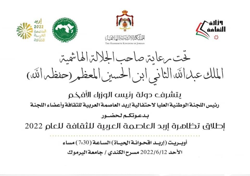 تحت رعاية صاحب الجلالة الهاشمية الملك عبدالله الثاني بن الحسين حفظه الله وبتشريف من دولة رئيس الوزراء الأفخم رئيس اللجنة الوطنية العليا لإطلاق “إربد العاصمة العربية للثقافة ” حضر ممثلي اتحاد قيادات المرأة العربية في الاردن أ. مها صالح ورجل الأعمال الدكتور محمد أبو رصاع لحفل إطلاق تظاهرة إربد العاصمة العربية للثقافة للعام ٢٠٢٢. وحضر الحفل كل من معالي الوزير المفوض السيدة سعاد السائحي ممثل أمين عام جامعة الدول العربية مدير إدارة الثقافة وحوار الحضارات، الأمين العام للمنظمة العربية للتربية والثقافة والعلوم ( الألكسو) معالي الدكتور محمد ولد أعمر، رئيسة هيئة البحرين للثقافة والآثار معالي الشيخة مي بنت محمد آل خليفة، ايضا مديرة إدارة الثقافة والفنون في هيئة البحرين سعادة الشيخة هلا بن محمد آل خليفة، وزيرة الشؤون الثقافية في تونس معالي الدكتورة حياة القرمازي، من فلسطين وزير الثقافة معالي الدكتور عاطف أبو سيف، من المملكة العربية السعودية الرئيس التنفيذي لهيئة المسرح والفنون الأدائية الاستاذ سلطان بن عبدالرحمن بن محمد البازعي وعدد من المسؤولين، وزير الثقافة القطري سعادة الشيخ عبد الرحمن بن حمد آل ثاني، من دولة الإمارات العربية المتحدة أمين عام برلمان الطفل العربي سعادة الأستاذ أيمن الباروت، من دولة الكويت الأمين العام للمجلس الوطني للثقافة والفنون والآداب سعادة الدكتور عيسى الأنصاري، من الجزائر وزيرة الثقافة والفنون الدكتورة صورية مولوجي، من سلطنة عُمان وكيل وزارة الثقافة والرياضة والشباب سعادة الأستاذ سعيد بن سلطان بن يعرب البوسعيدي، حضور ايضا وفد من الأمانة العامة لمجلس التعاون الخليجي ممثل إدارة الثقافة والسياحة والآثار الاستاذ بندر بن حيلان المخلفي.
