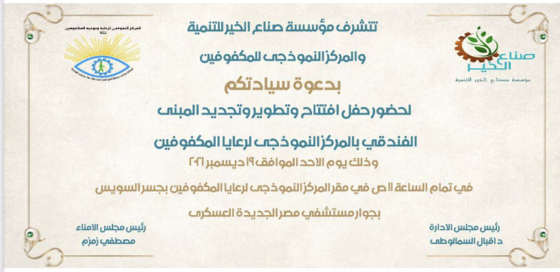 بدعوة كريمة من الأستاذة الدكتورة إقبال السمالوطي رئيس مجلس إدارة المركز النموذجي للمكفوفين و رئيس اللجنة الإجتماعية بالاتحاد وبمناسبة اليوم الدولي للأشخاص ذوي الإعاقة مشاركة إتحاد قيادات المرأة العربية بحضور كل من الدكتورة هالة عدلي حسين الأمين العام للإتحاد والدكتورة سحر فؤاد رئيس وحدة الاستشارات والتدريب بالأمانة العامة والدكتورة نداء الحديدي عضو مؤسس بالاتحاد والدكتورة سوسن صالح عضو مؤسس بالاتحاد حفل افتتاح فندق المركز النموذجي المكفوفين وذلك تحت رعاية وزيرة التضامن الدكتورة نيفين قباج واللواء خالد عبد العال محافظ القاهرة وجمعية صناع الخير وبنك الامارات دبي الوطني