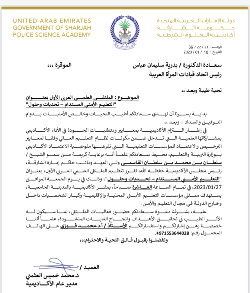 بدعوة كريمة من أكاديمية الشرطية بحكومة الشارقة بدولة الإمارات العربية مشاركة الدكتورة بدرية سليمان رئيس إتحاد قيادات المرأة العربية في الملتقى العلمي العربي الأول بعنوان ” التعليم الأمني المستدام – تحديات وحلولها