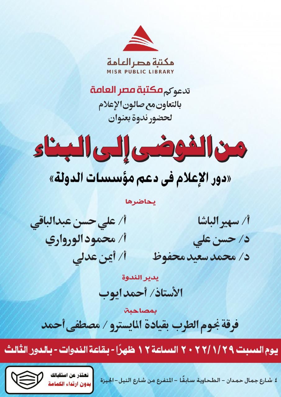 بدعوة كريمة من مكتبة مصر العامة حضور المستشار عدلي حسين رئيس الشراكة الأورومتوسطية COPPEM والمستشار القانوني لإتحاد قيادات المرأة العربية وعضو اتحاد قيادات المرأة العربية جمهورية مصر العربية في ندوة بعنوان ” من الفوضى إلى البناء” حيث تناقش دور الإعلام في دعم مؤسسات الدولة