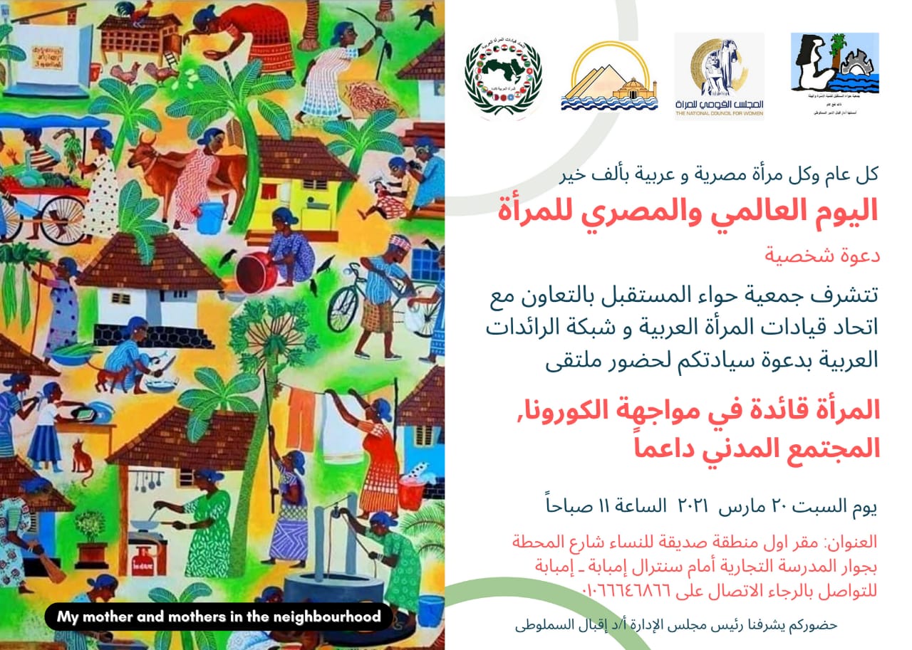 بدعوة كريمة من الاستاذة الدكتورة اقبال السمالوطي رئيس جمعية حواء المستقبل ورئيس اللجنة الاجتماعية لاتحاد قيادات المرأة العربية وبمناسبة اليوم العالمي والمصري للمرأة يشارك اتحاد قيادات المرأة العربية في احتفالية جمعية حواء المستقبل تحت عنوان المرأة قائدة في مواجهة الكورونا