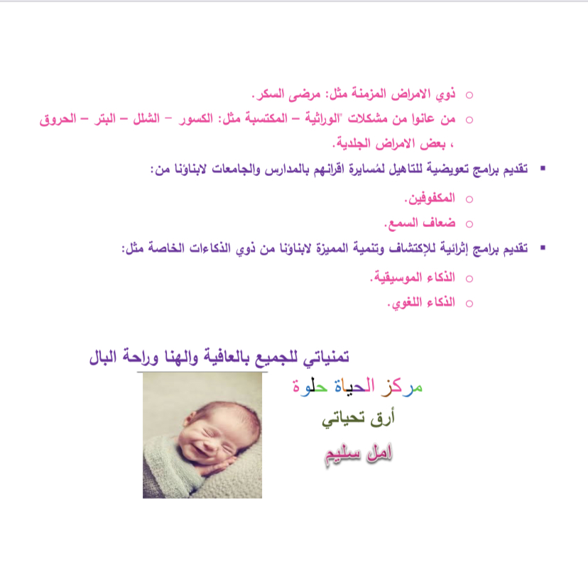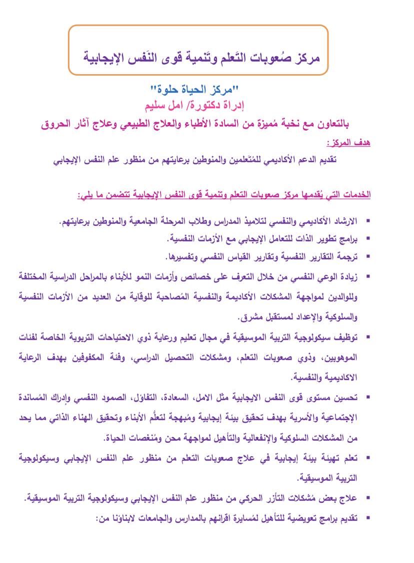 يعلن مركز صعوبات التعلم وتنمية قوى النفس الإيجابية ” مركز الحياة حلوة” عن مجانية زيارة أعضاء إتحاد قيادات المرأة العربية