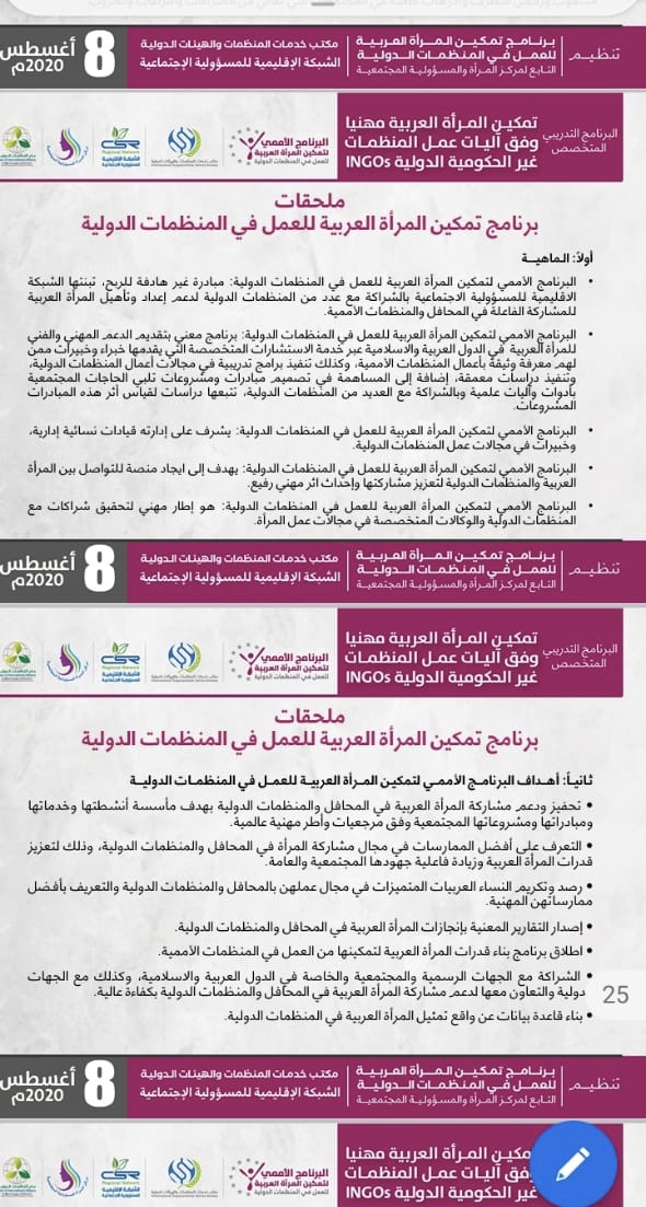 مشاركة الدكتورة نجوى باللطيف عضو إتحاد قيادات المرأة العربية في البرنامج التدريبي ” تمكين المرأة العربية مهنيا وفق آليات عمل المنظمات غير الحكومية الدولية INGOs