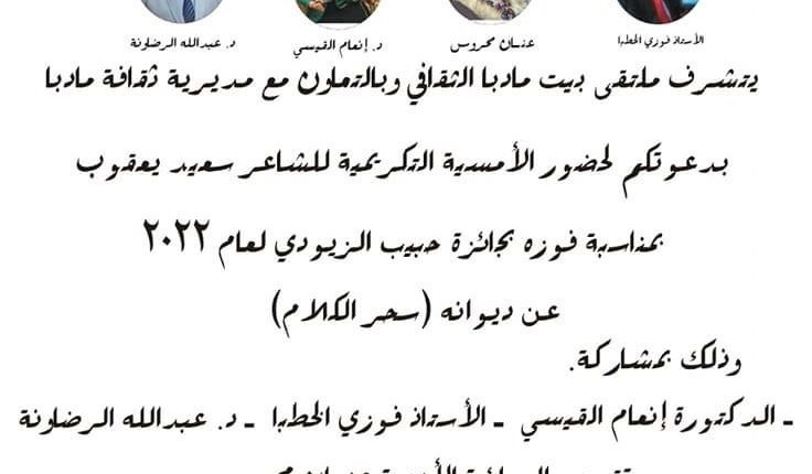 Sous les auspices de l’homme d’affaires et président du Comité économique des femmes arabes , Mohammed Abu Rasa, tient le Forum culturel de Madaba en Jordanie en coopération avec la direction de la culture Madya ,une soirée honorant le poète jordanien “Said Yacoub” de la présentation du romancier et l’ecrivaine Annan Mahrous.
