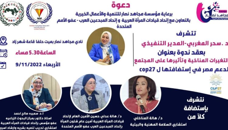 La Fédération des Leaderships des Femmes Arabes organise un symposium sur le changement climatique et son impact sur la société en coopération avec la Fondation Mijahid Pour la charité et l’Union des créateurs arabes – Membre des Nations Unies dans le cadre de la tenue de la COP27 sur le climat à Charm el-Cheikh, Égypte.
