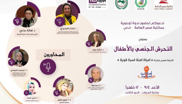 La Fédération Des Leadership  Des Femmes Arabes a participé au symposium sur le harcèlement sexuel des enfants en collaboration avec la Foundation « Forssane El Hadidy » du Développent et en présence de Dr Hala Adly Hussein, secrétaire générale de la Fédération, et de Dr Sahar Fouad, Chef de l’unité de formation et de conseil du Secrétariat,et Dr Mayson Al-Fiomi , membre fondateur de la Fédération et président du Comité de l’éducation en Égypte. Ceci est à l’invitation du Dr. Nidaa Al-Hadidi, Président du Conseil d’administration de la Fondation « Forssane El Hadidy » et membre fondateur de la Fédération .